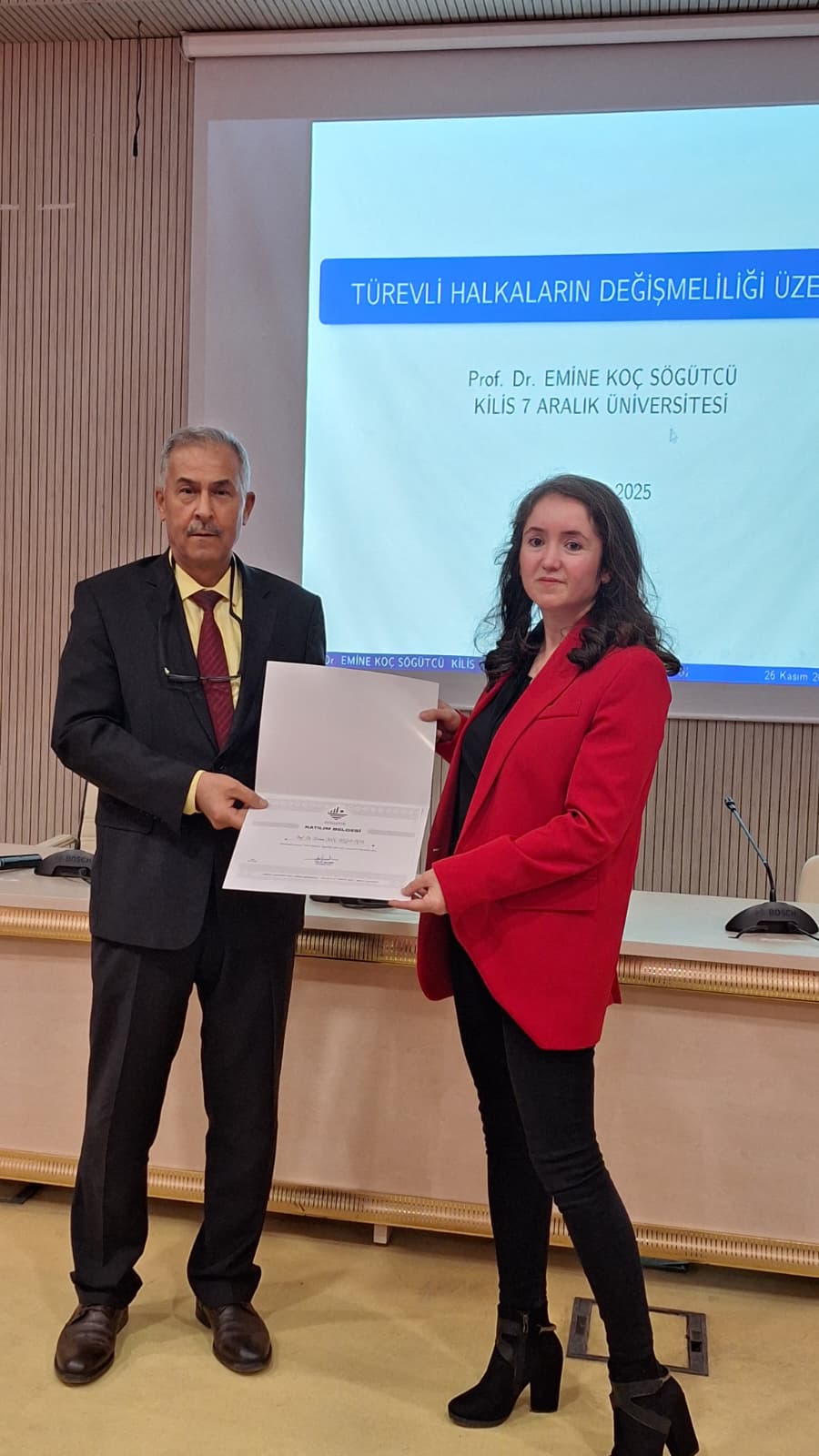 Seminer, soru-cevap bölümünün ardından, etkinliğe katkılarından dolayı Prof. Dr. Emine Koç Söğütçü’ye teşekkür belgesi Prof. Dr. Kani Arıcı tarafından takdim edildi.