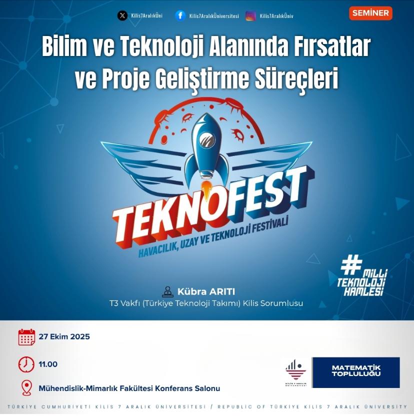 Fakültemiz Matematik Topluluğu tarafından TEKNOFEST kapsamında düzenlenen “Bilim ve Teknoloji Alanında Fırsatlar ve Proje Geliştirme Süreçleri” konulu seminer, 27 Ekim 2025 pazartesi günü saat 11:00’de Mühendislik Mimarlık Fakültesi Konferans Salonu’nda gerçekleştirildi.